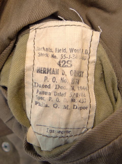 このジャケットは第2次世界大戦時に支給されたフィールドジャケット Jacket Field Wool OD です、イギリス軍のフィールドジャケットを参考にして作られた野戦服(フィールドジャケット)ですが当時兵士に支給されたもののフィールドで着用する兵士が少なく兵士の多くは後方でこのフィールドジャケットを着用していました、その後M41フィールドジャケットが支給されたためなんとなく消えてしまったフィールドジャケットです、ですのでアメリカ軍のフィールドジャケットとしては知名度は低くあまり人気のないジャケットです。