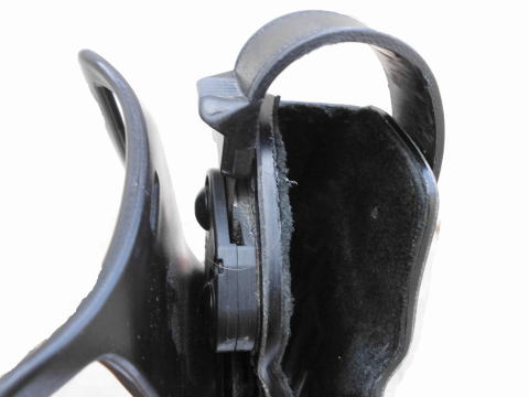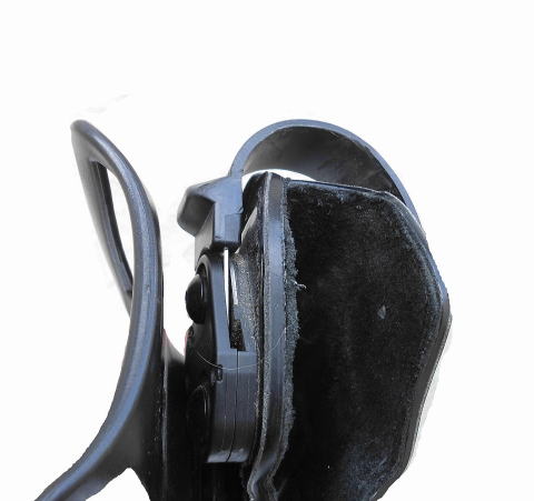 このデューティーホルスターのセーフティー機構は矢印のノッチを上に上げないと