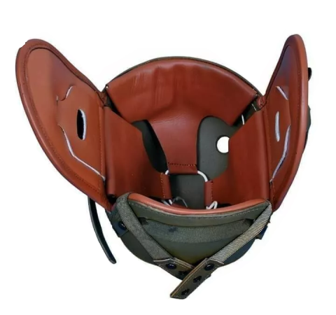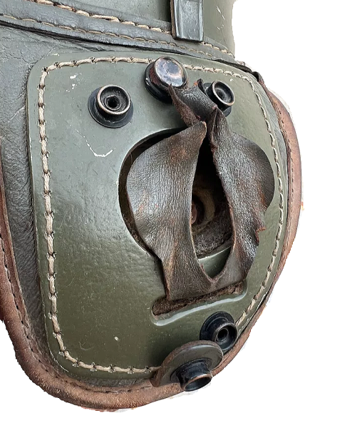 またM1938 ヘルメットの旧型ヘルメットとの大きな違いとして革製のイヤーフラップ、アッセンブリー(耳当て部)の導入があげられます、耳当ては着用後に耳の下まで被れイヤホン用ハウジングがイヤホンを適切な位置にしっかりと固定します、またレザー製耳当てにはイヤホンを収納する穴が空いておりイヤホンをしっかりと固定することが出来ます、次にこのM1938 ヘルメットは後期型でいくつか改良点があります、大きな改良点としてはヘルメットの外殻に8個の3/4インチの穴が空けてありこれはあヘルメットの