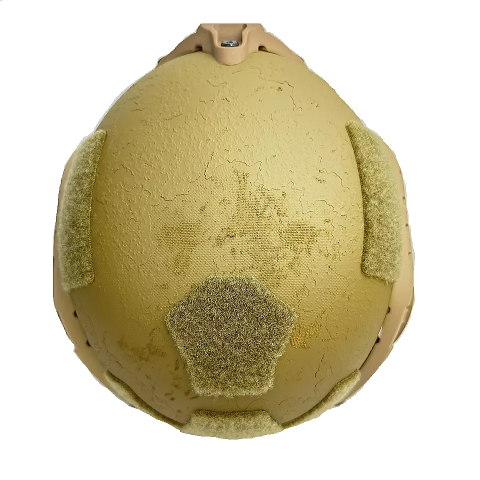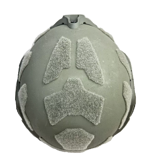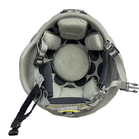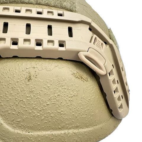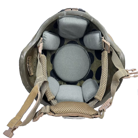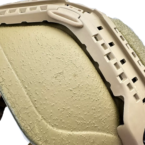 ヘルメットの材質はアラミド繊維(ケブラー)を主体としたFRP製(繊維強化プラスチック)ヘルメットの外側はコヨーテブラウンに塗装され更に1mm程度の砂状の粒子が塗装に混ぜられています、インナーにはクッションパッドを固定するためのベルクロが貼られています。