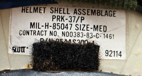アメリカ海軍の80年代フライトヘルメット HGU-33/Pです、このヘルメットは以前の海軍のフライトヘルメットのAPH−6シリーズの軽量化を目指して開発されます、ベースのシェル(帽体)はPRK-37/Pでファイバーグラスとエポキシレジンの積層構造で軽量化を図っています、またエッジロールには耐衝撃の為にスポンジ入りの黒革を使用しています、次にライナーにはVTECフォームフィットライナーを使用しバイザーにはEEK-4A/Pバイザーアッセンブリーを使用、コミュニケーションシステムにはH-87B/Wを使用します。
