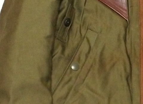 フライトジャケット B-15Aとともに着用するフライングトラウザータイプA-11Aです、前モデルA-11フライングトラウザーとの相違点は左脇に設けられた非常用酸素ボトルの収納ポケットです、2段に重なったフラップの上段からは酸素マスクに接続する酸素チューブのプラグを出します、下段ポケットには酸素ボトルを収納しその上のフラップからは酸素供給トリガーを突き出しておきます。