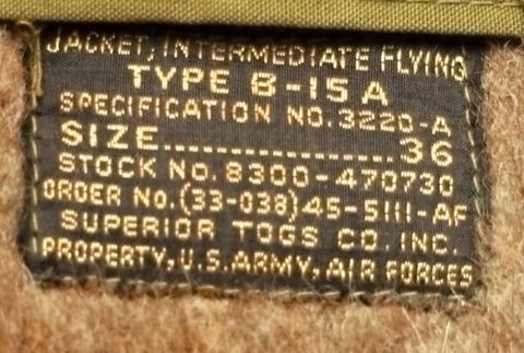 B-15Aはアメリカ陸軍航空隊で採用されその優れた機能性で高い評価を得ているフライトジャケットです、その評価は保温性が高く軽量であり動きやすく必要なものは全て揃っているが無駄なものはない、また生産コストが革製のものに比べ安く丈夫で長持ちである等です、ただB-15Aは第2次世界大戦の末期に登場したため十分な生産数は確保出来ませんでした、ですのでB-15Aがアメリカ陸軍航空隊のフライトジャケットとして行き渡るには1945年以降を待たねばなりませんでした。