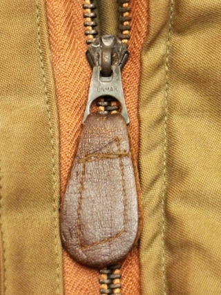 このフライトジャケットはUSAAF アメリカ陸軍航空隊のフライトジャケット B-15Aです、このB-15AはB-15の登場からわずか4か月後の1944年11月にB-15の改良型として採用されます、B-15と同じくコットン製のシェル、アルパカの防寒用ライニング、ムートン製のボア襟を持ちます、その改良されたB-15Aの主な点は航空機内部での通信に使用するICSコードと酸素マスクをパイロットの体にしっかりと固定しておく為の胸の三角タブ等が新たに付けられています、両脇腹のループにはICSのコードと非常用酸素ボンベのチューブを通します。