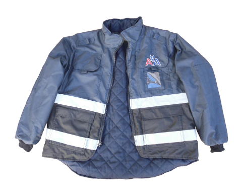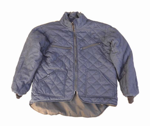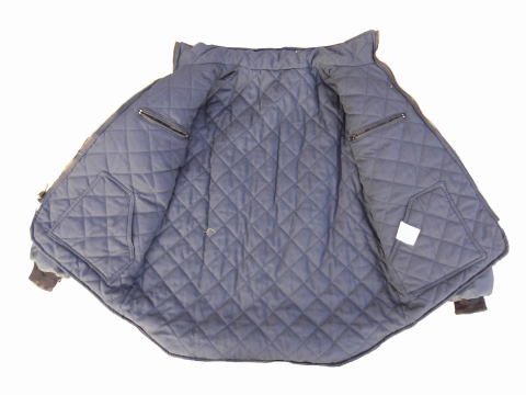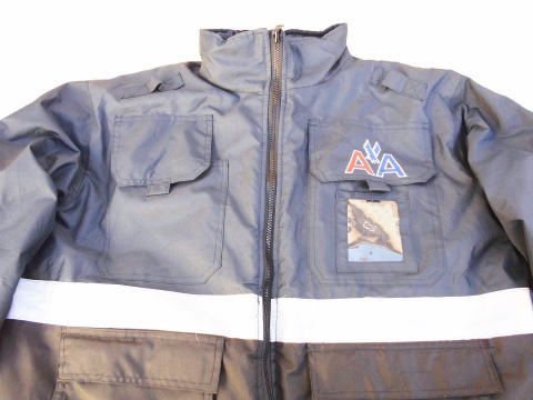 ジャケットの胸にはアメリカンエアーラインの会社のロゴマークが刺繍され、リフレクティブテープ(反射テープ)がジャケットの周りに付けられ夜間の安全に付与しています、また胸にはID身分証を入れる透明ケースが付いています、またポケットは大型で収納力も高くポケットの数も10個も付きます、次にワークジャケットらしいのが肩口につく無線のマイクを引っかけて置くためのタブですね、またこのジャケットの大きな特徴としてジャケットはリバーシブルとなっています、表はリフレクティブテープが貼られインナーはキルティング加工されていますがその裏面でも着用が可能となっています。