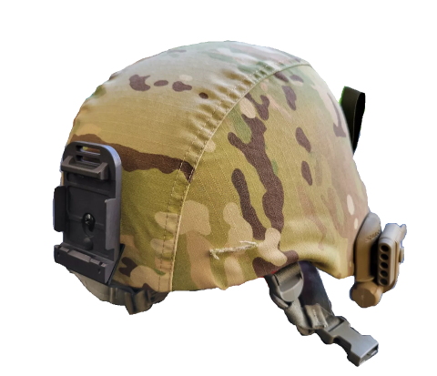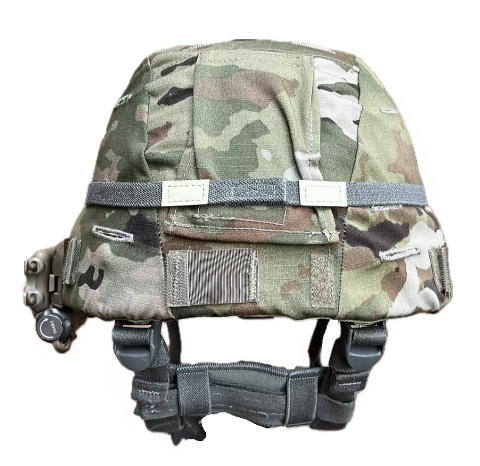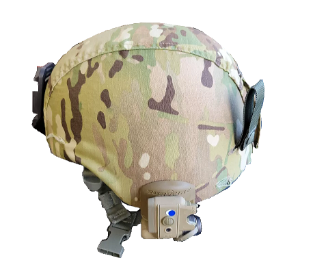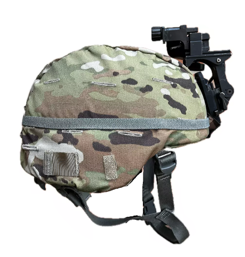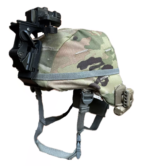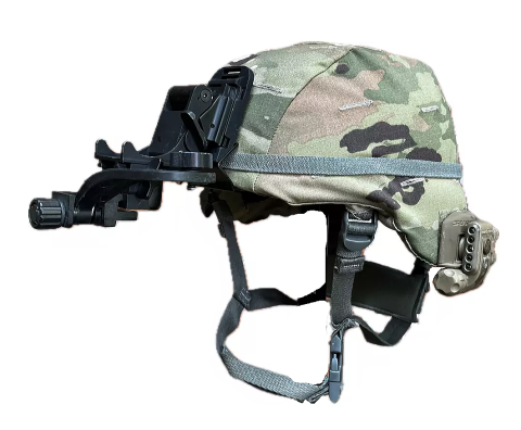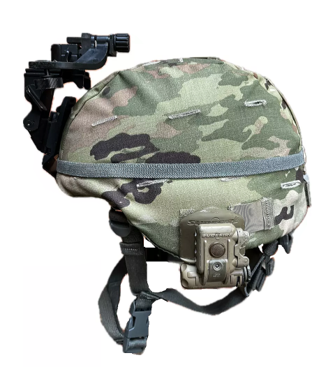 この防弾戦闘用ヘルメットは、アメリカ陸軍に採用されているMSA社製 ACHヘルメットです、ヘルメットには迷彩カバーが付き、これは2015年以降に採用されたOCP迷彩カバー(OPRATIONAL CAMOFLAGE PATTERN)が付いています、またヘルメットにはNOROTOS社製のナイトビジョンゴーグル取り付け用マウント、SURFFIRE社製のHL1‐A