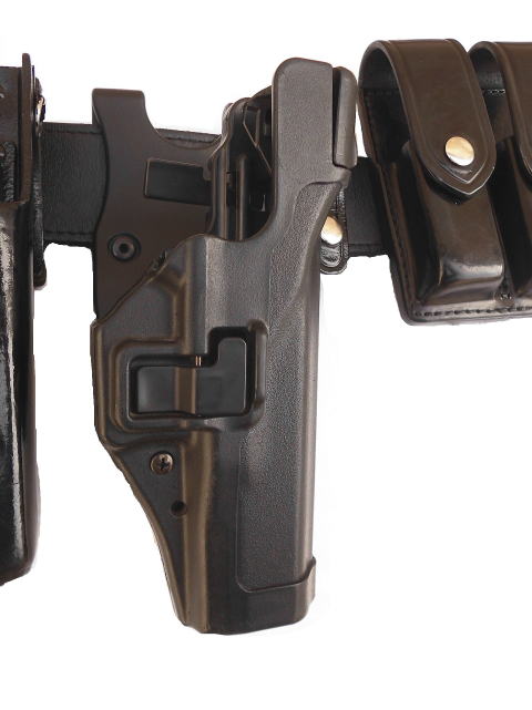 このデューティーホルスターはBLACKHAWK社のセルパ レベル3 オートロック デューティーホルスターです、このホルスターはレベル3のセーフティー機構を備え犯人等ともみ合いになった際に犯人にハンドガンを奪われる危険を防いでくれます、最近のデューティーホルスターはほとんどこのセーフティー機構がついておりそれだけ犯人にハンドガンを奪われる事案が多いんだと思います、このセルパ レベル3にはまず親指でセーフティーを外す機能、これは上部につくノッチを押し込むことで自動的に外れます、このノッチをまず押してから次に人差し指でセンター付近にあるノッチを押し込むことでやっとハンドガンのセーフティーは解除されます、この2つの機構を解除しないとハンドガンは引き出せません。