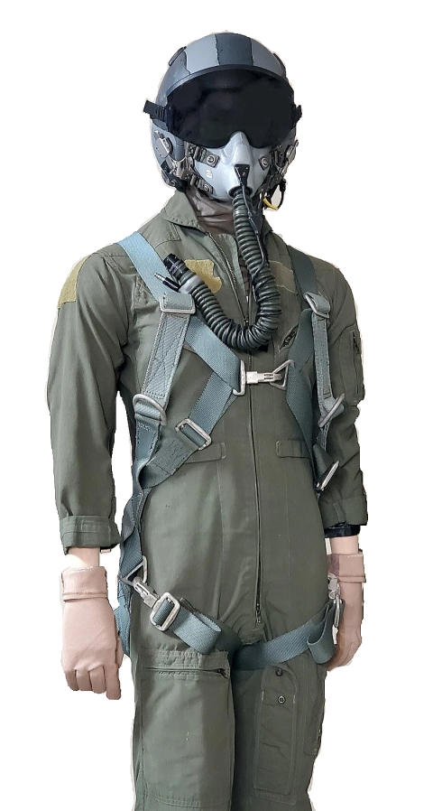 このフライト装備はアメリカ空軍の固定翼航空機乗員の緊急脱出用装備品です、固定翼機はアメリカ空軍で使用している C-141 輸送機 C-130 輸送機 B-52 戦略爆撃機 T-37 T-38 練習機等のパイロット 乗員 カーゴマスター等が緊急脱出時にこのBA-22 パラシュートを着用し脱出します。写真のフライト装備ではHGU-55/P フライトヘルメットを着用しMBU-12/P 酸素マスクを装着し背中にはBA-22 高速緊急パラシュートシステムを着用しています。