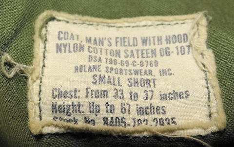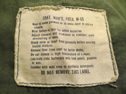 上の2つは初期型のM-65ジャケットのラベルです、これは1969年モデルですが、初期型は当初はM-65の名称を使っていましたが後期型ではM-65の名称は省略されています