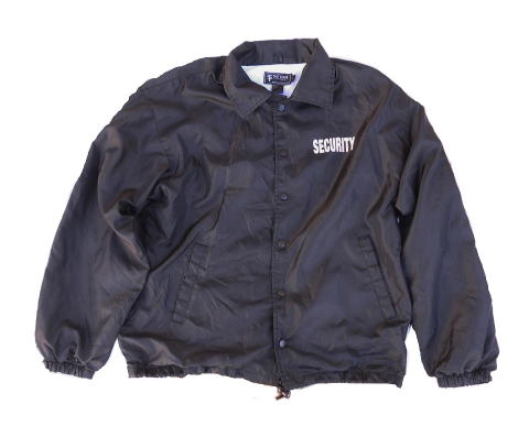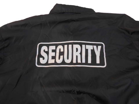 このウインドブレーカーはTACT SQUAD社製のものです、基本的にポリスの着用するレイドジャケット(ウインドブレーカー)と同じです、アウター生地はナイロン100%でナイロンに防水処理が施してありインナーはポリエステル100%で保温性を高める素材です、このウインドブレーカーはSECURITYの文字が胸と背中にペイントされたものです。