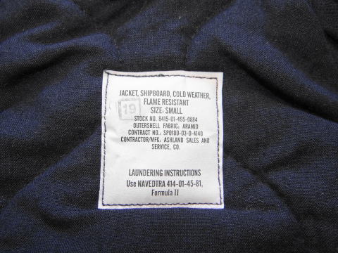 アメリカ海軍現用デッキジャケットです、アラミド繊維使用でCold Weatherですのでインナーも厚く暖かいジャケットです、バックにマーカーで数字が書かれていますが、それ以外は新品で軍の新品のラベル付きです