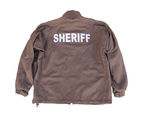 | ソフトシェルジャケットの背中に”SHERIFF”のリフレクティブ文字入り |